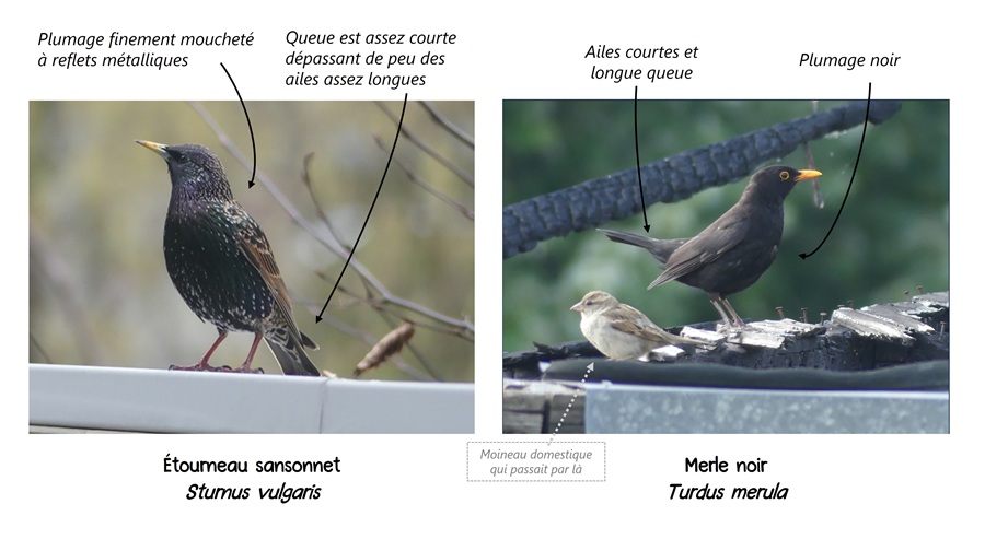 En parlant d’imitation, il parait que vous nous confondez souvent avec le Merle noir. Loin de moi l’idée de manquer de respect à un confrère, mais notre plumage est tout de même plus complexe. Prenez le temps de nous observer quand on vient squatter votre jardin. Vous remarquerez nos reflets verts et violets, mouchetés de points blancs. En plus, même notre silhouette est différente : nos ailes sont plus longues et plus pointures.
